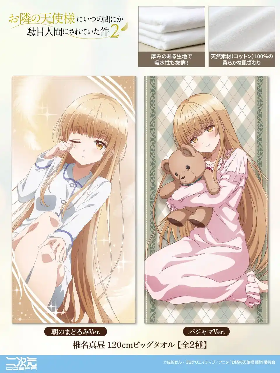 TVアニメ『お隣の天使様にいつの間にか駄目人間にされていた件』より、椎名真昼の可愛い姿を堪能できる「120cmビッグタオル」朝のまどろみVer.、パジャマVer.の2種類が二次元コスパから新たに登場いたします。 |