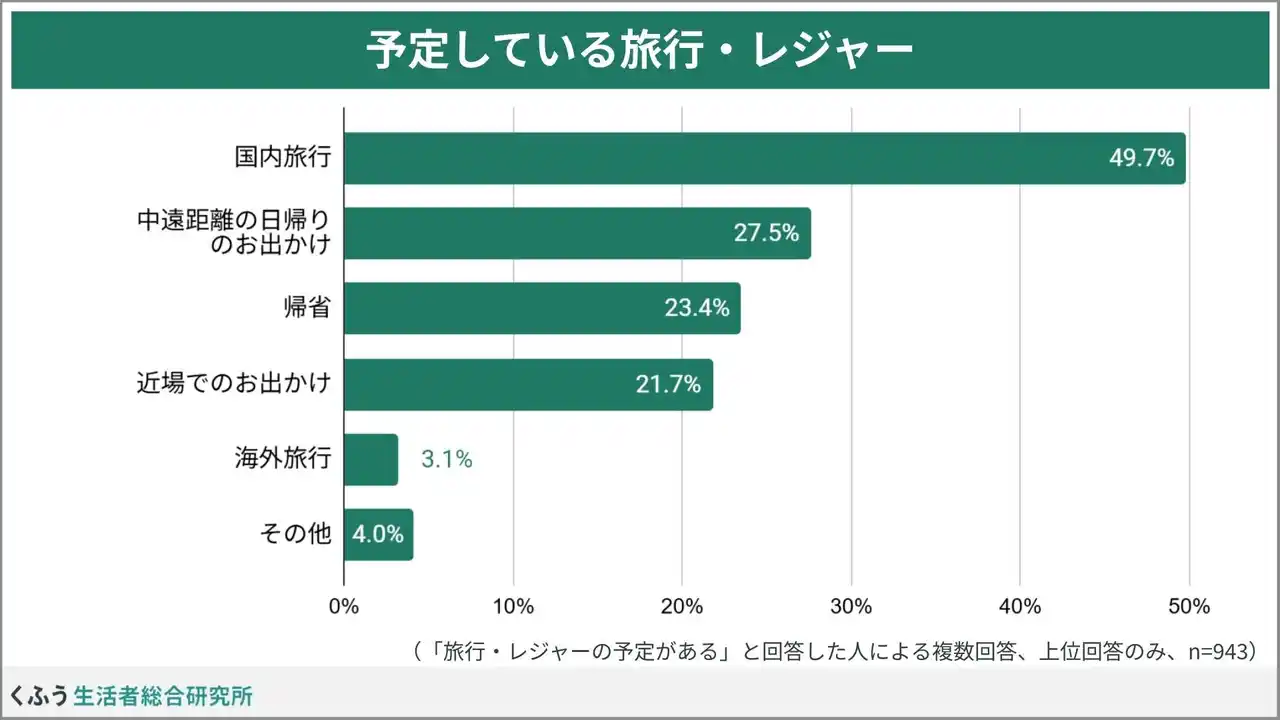 予定している旅行・レジャーは「国内旅行」が約半数(49.7%)。「中距離の日帰りのお出かけ」(27.5%)、「帰省」(23.4%)、「近場でのお出かけ」(21.7%)が続きました。 |