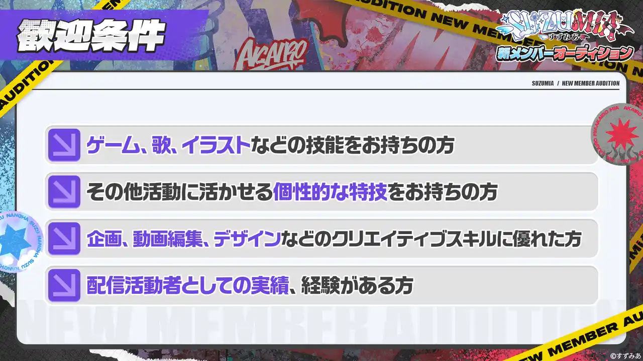 ・YouTuber、ライバー、声優、歌手などプロ活動の経験は問いません。(未経験者可) |