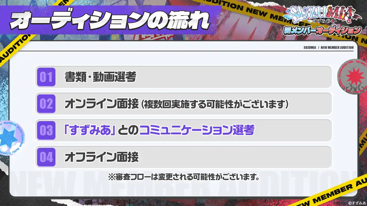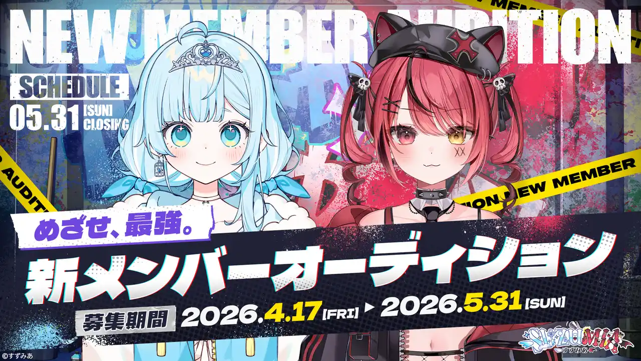 ファンと共に作る最強VTuberユニット「すずみあ」は、2025年12月5日(金)にデビューし、2026年2月にはオンラインでの1on1イベントの開催やグッズ販売を実施。デビューから約4ヶ月となる同年3月末には、YouTubeチャンネル総登録者数13万人を突破しました。さらに、ファンミーティングの開催も決定するなど、デビュー以来、瞬く間に成長してまいりました。この度、共に『最強』を目指す、新メンバのーオーディションを開催します。 |