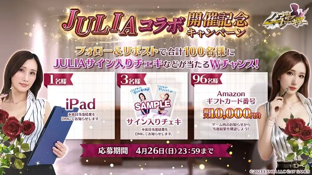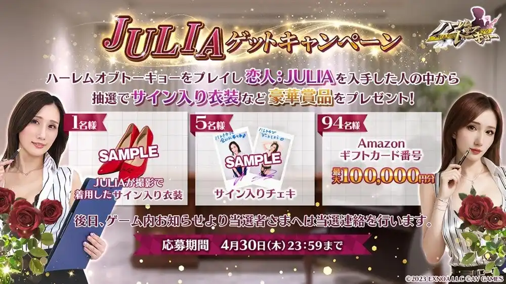 人気セクシー女優のJULIAさんとのコラボレーションを記念して、抽選で合計100名様にゲーム内に登場する衣装を着用したサイン入りチェキや、最大10,000円のAmazonギフトカード番号が当たるキャンペーンを実施致します。 |