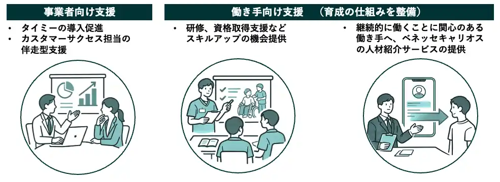 事業者に対し、ベネッセキャリオスの専門性を活かしてタイミー導入に向けた営業活動を実施します。介護事業運営のノウハウを活用した業務分解の提案やマニュアル作成など、手厚いカスタマーサポートおよびコンサルテーションを提供します。 |