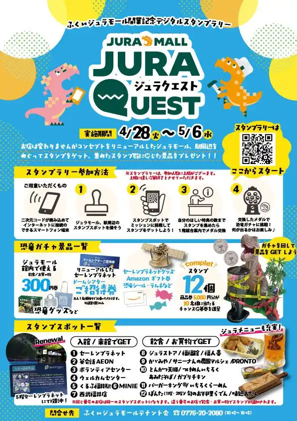 リニューアルしたふくいジュラモールの館内、福井駅周辺を巡るデジタルスタンプラリーを開催します。各スポットでスタンプを集め、獲得数に応じてメダルをプレゼント。メダルを使って恐竜ガチャに挑戦し景品をゲットすることができます、館内で使える商品券やセーレンプラネットドームシアター招待券などの景品が当たります。 |