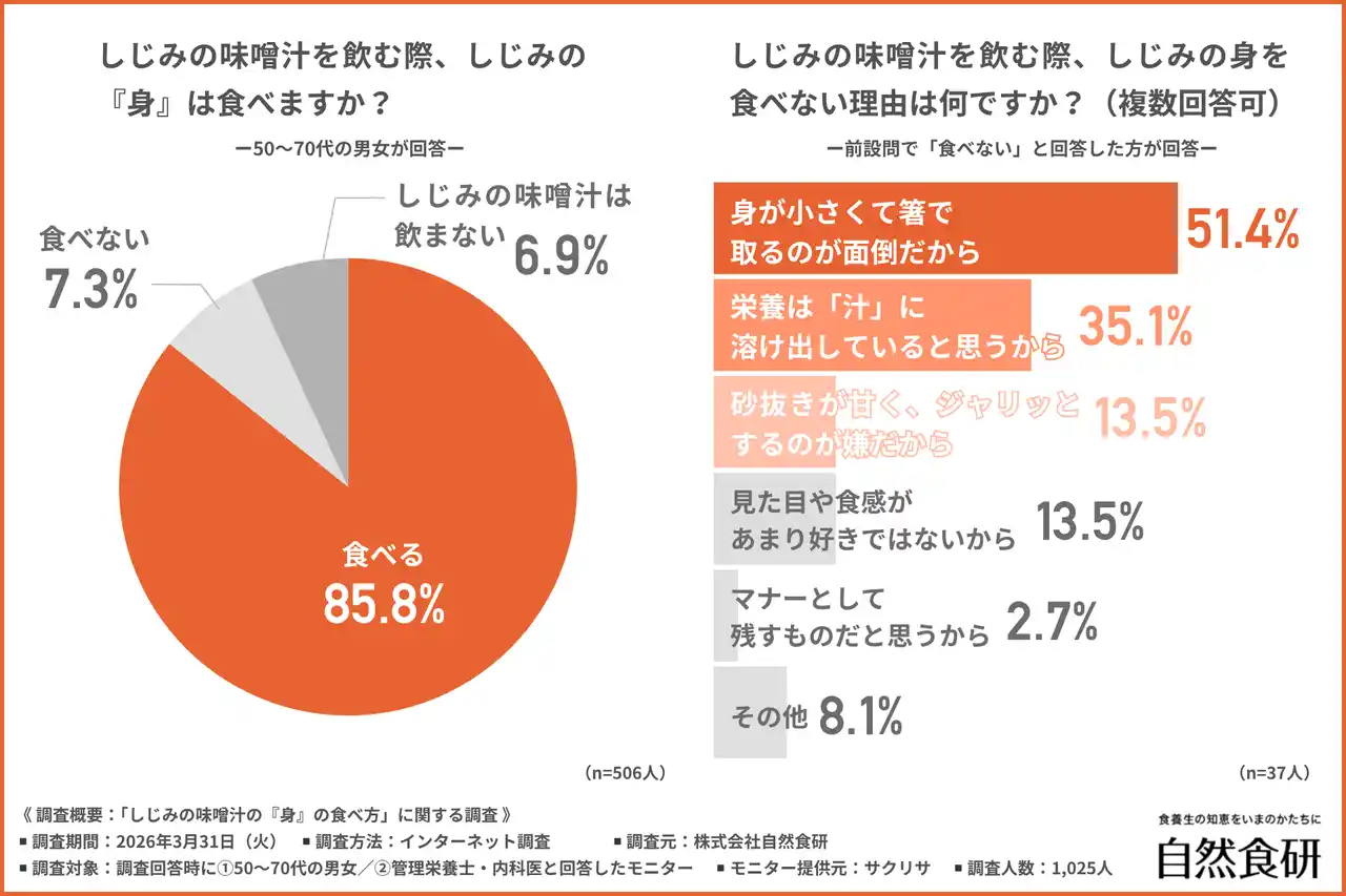 株式会社自然食研(所在地:大分県豊後高田市、代表者:佐々木 興平)は、1.50~70代の男女/2.管理栄養士・内科医を対象に、「しじみの味噌汁の『身』の食べ方」に関する調査を行いました。