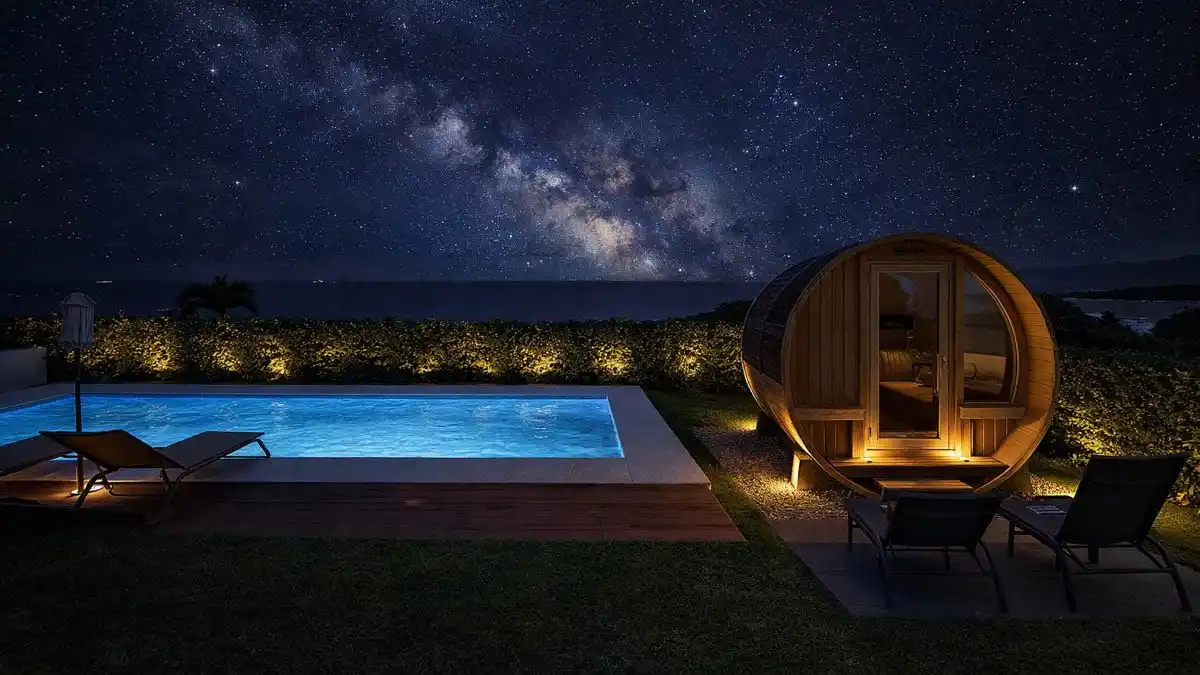 屋外プール横に、HARVIA製のバレルサウナを設置。 大きなガラス面を備え、海を望みながらサウナを楽しめる開放的な空間となっています。 高台に位置する立地と、町明かりの少ない環境により、日本初の星空保護区にも認定される石垣島の美しい星空を望むことが可能。