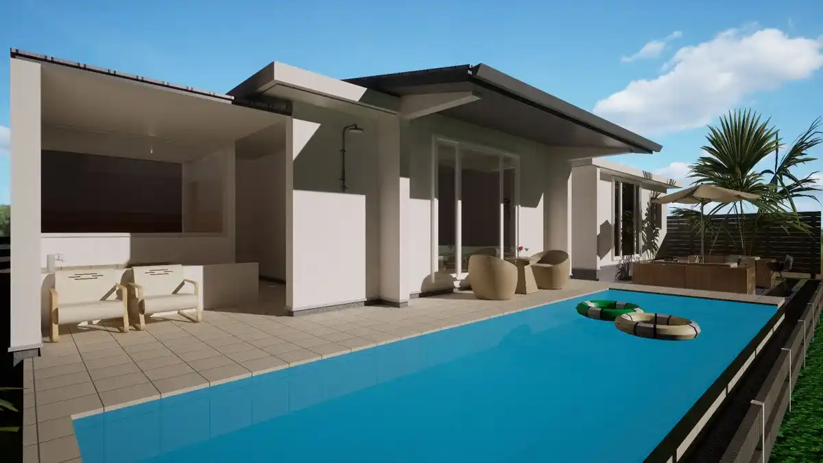 屋外のウッドデッキの先には、10m×5mのガーデンプール。 高台から海を望むロケーションと、プールの水面越しに広がるオーシャンビューが、石垣島ならではの開放感を際立たせます。 さらに、滞在中の時間を施設内で完結できるようBBQ設備も設置。 |