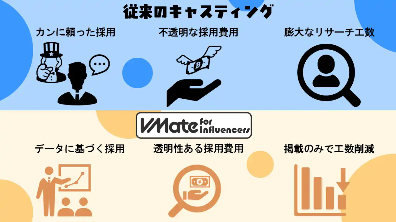 属人的な勘に頼った選定や不透明な中間費用(ブラックボックス)を排除し、企業が自らデータに基づいた論理的なキャスティングを行える仕組みとして「VMate」を開発しました。 |