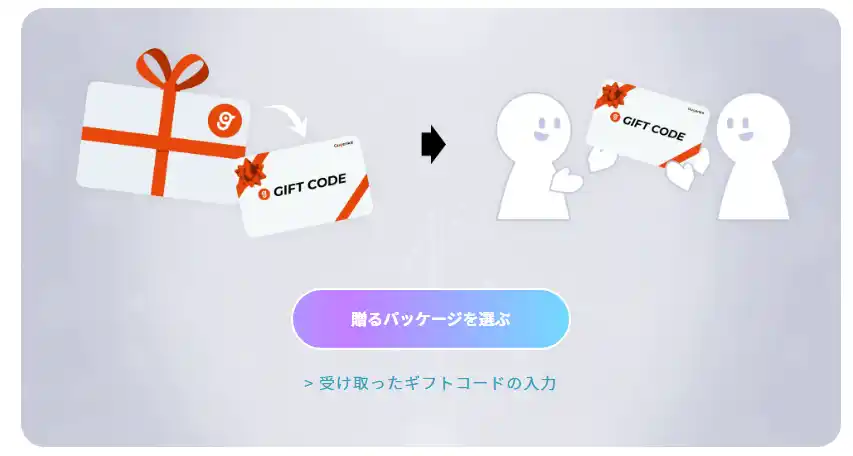 贈る側のユーザーが所持しているデジタルグッズをギフトコードに変換、贈られた側のユーザーがギフトコードを引き換えることで、デジタルグッズを使用できるようになります。 |