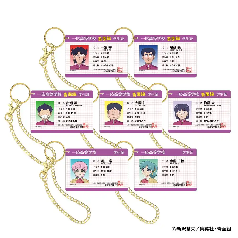 「一堂 零」、「冷越 豪」「出瀬 潔」、「大間 仁」、「物星 大」、「河川 唯」、「宇留千絵」の学生証風デザインのバッグチャーム。 |