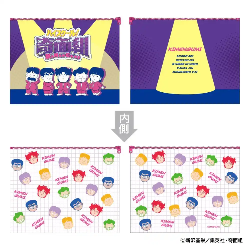 「奇面組」メンバーをレトロポップなテイストでデザイン。ジップを開けると内側に散りばめられたメンバーの顔がのぞく、遊び心あふれる両面プリントポーチです。 |