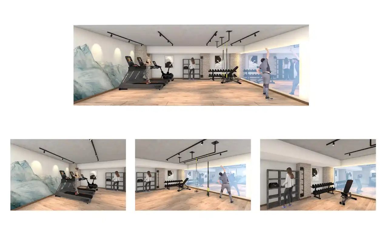1. ニセコの象徴「山々」をモチーフにしたアーティスティックな内装 ジムの壁面には、ニセコの雄大な山脈をイメージしたダイナミックなグラフィックを配置。木目調のフロアと黒を基調としたシックな照明が、落ち着きと高揚感を同時に演出します。 |