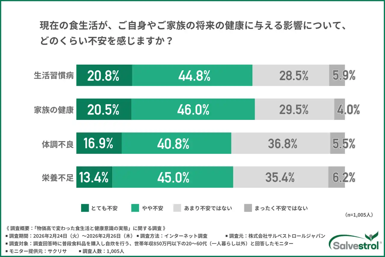 その結果、生活習慣病、家族の健康、体調不要、栄養不足といった項目について、約6割が不安を感じていると回答しました。 |