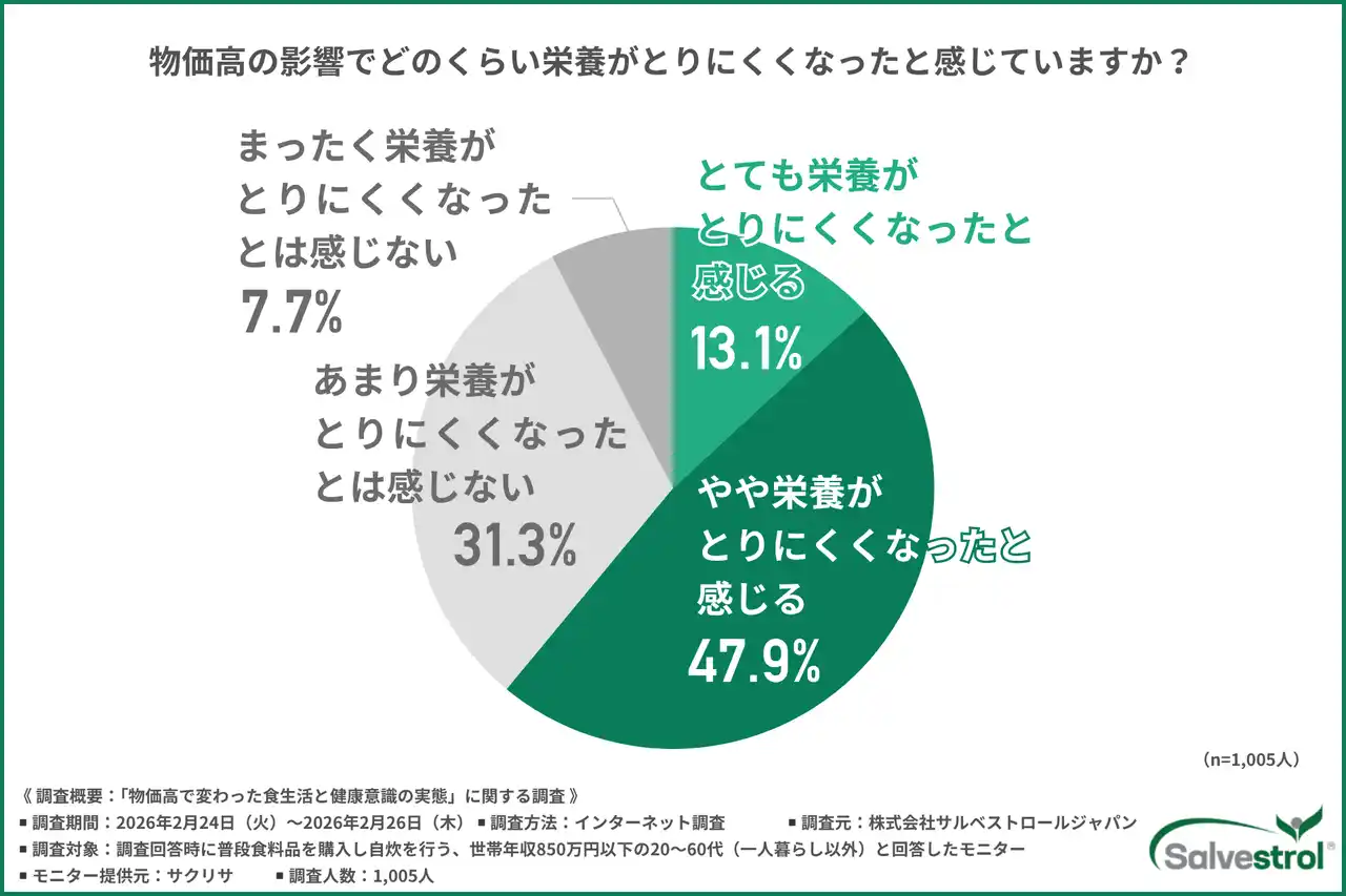株式会社サルベストロールジャパン(所在地:東京都渋谷区)は、物価高の影響を実感している世帯年収850万円以下の20~60代(※一人暮らしを除く)を対象に、「物価高で変わった食生活と健康意識」に関する調査を実施しました。 |