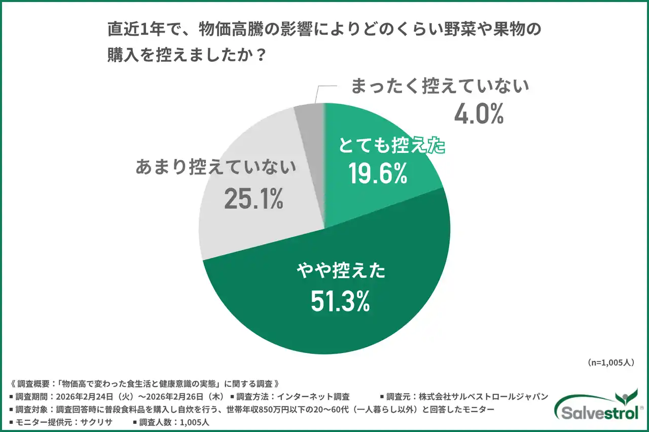 「物価高騰の影響で野菜や果物の購入を控えたか」という質問では、約7割(とても控えた :19.6%、やや控えた:51.3%)が野菜や果物の購入を控えていると回答しました。 |