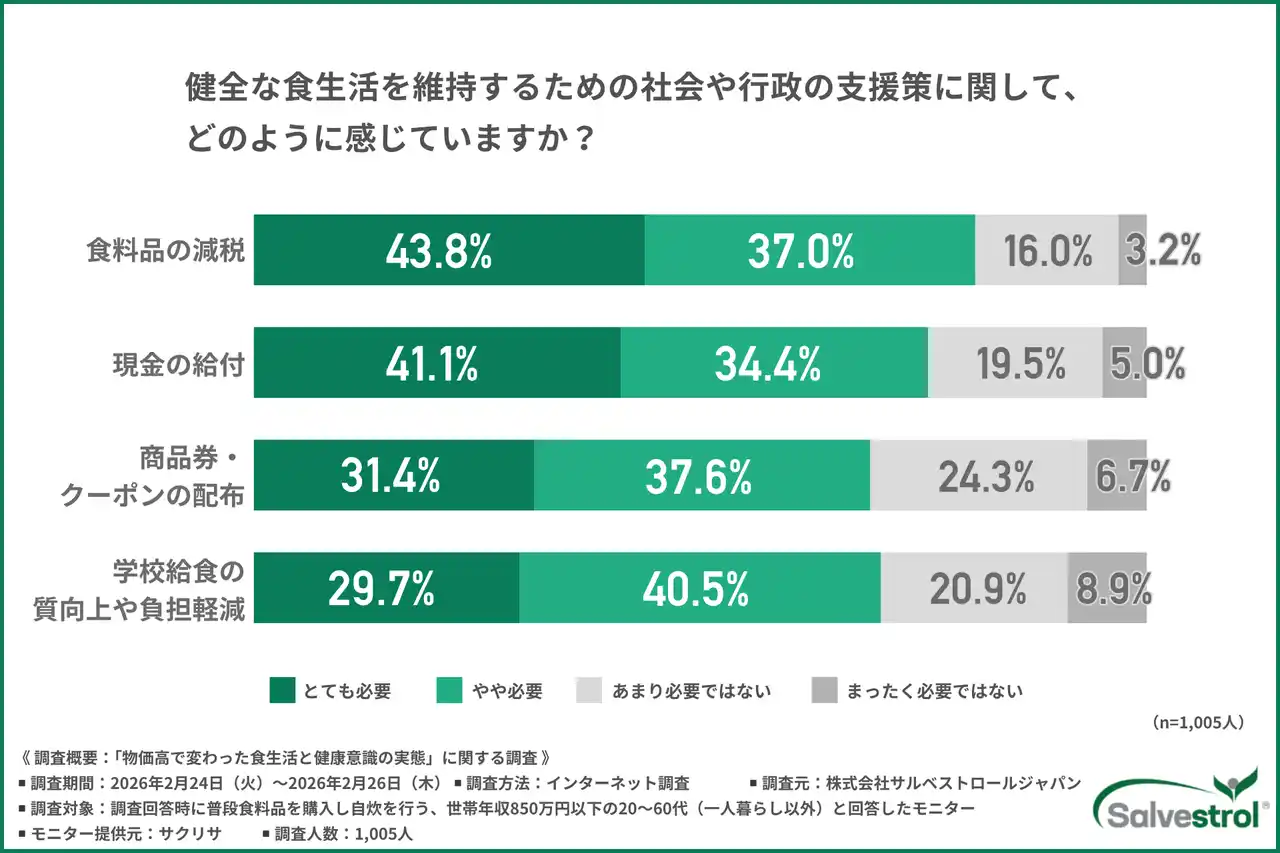 また、約8割が「食料品の減税」などの公的支援を求めていることは、物価高による栄養不足の問題が、個人の工夫や努力の限界を超えた社会的課題であることを示唆しています。 |