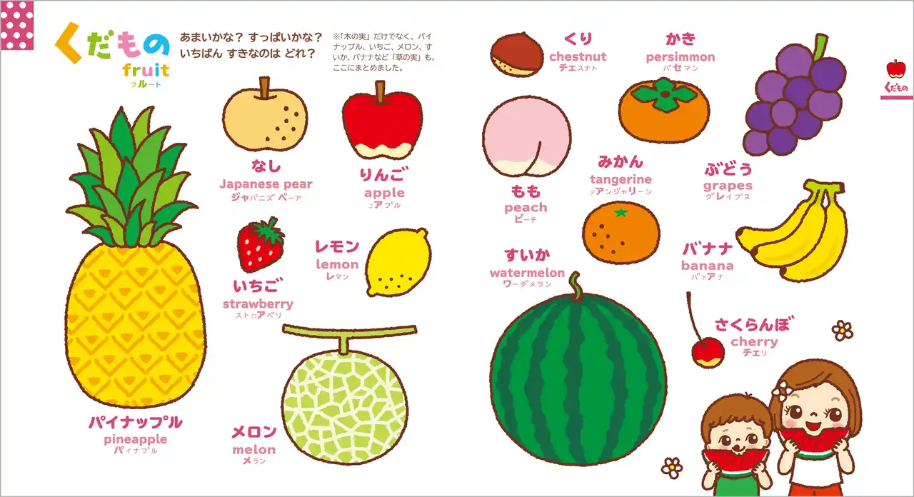 『0さい~4さい こどもずかん英語つき 改訂バージョン』に掲載された「どうぶつ」「くだもの」「やさい」「のりもの」「くるま」「はな・きのみ」「むし」「からだ」「いろ・かたち」「かず」の全テーマに対応し、日本語と英語両方の音声を、何度でも繰り返し確認することができます。 |