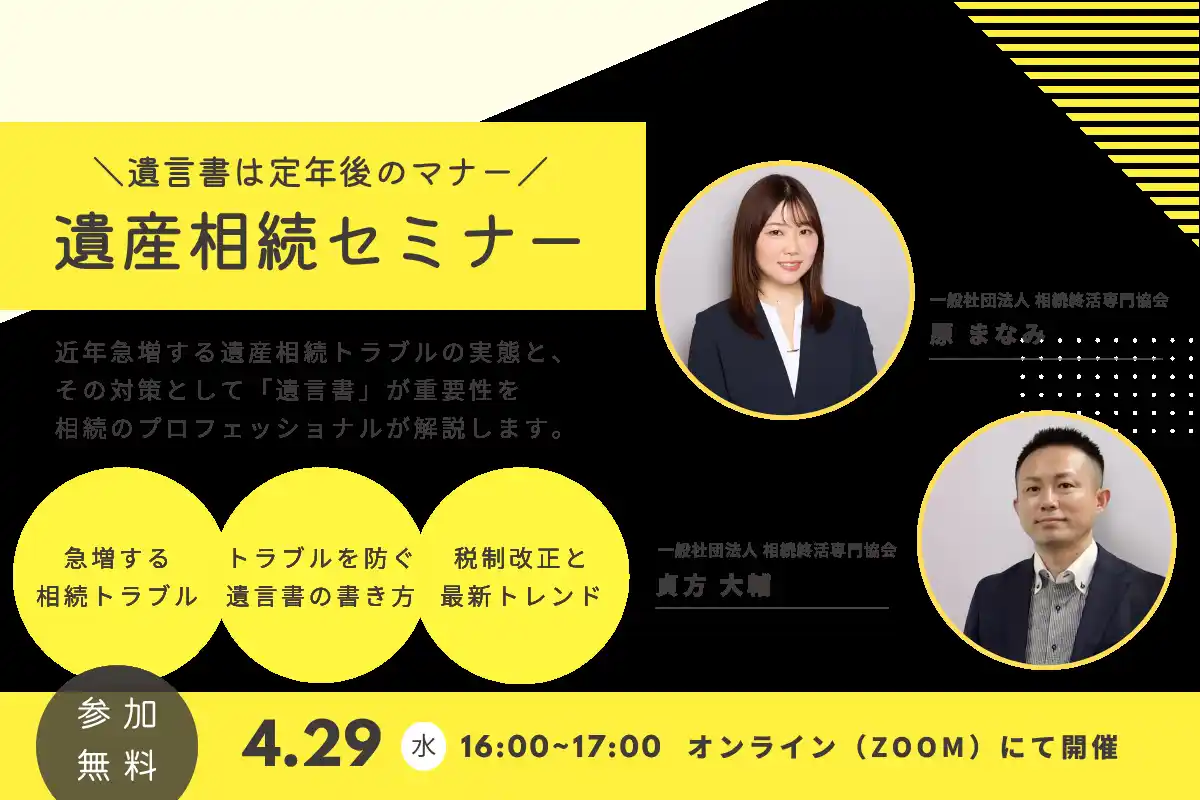 一般社団法人 相続終活専門協会(所在地:東京都千代田区、代表理事:貞方 大輔)は、近年急増する遺産相続トラブルの実態と、その対策として「遺言書」の重要性を解説する無料ウェビナーをオンラインで開催いたします。 |