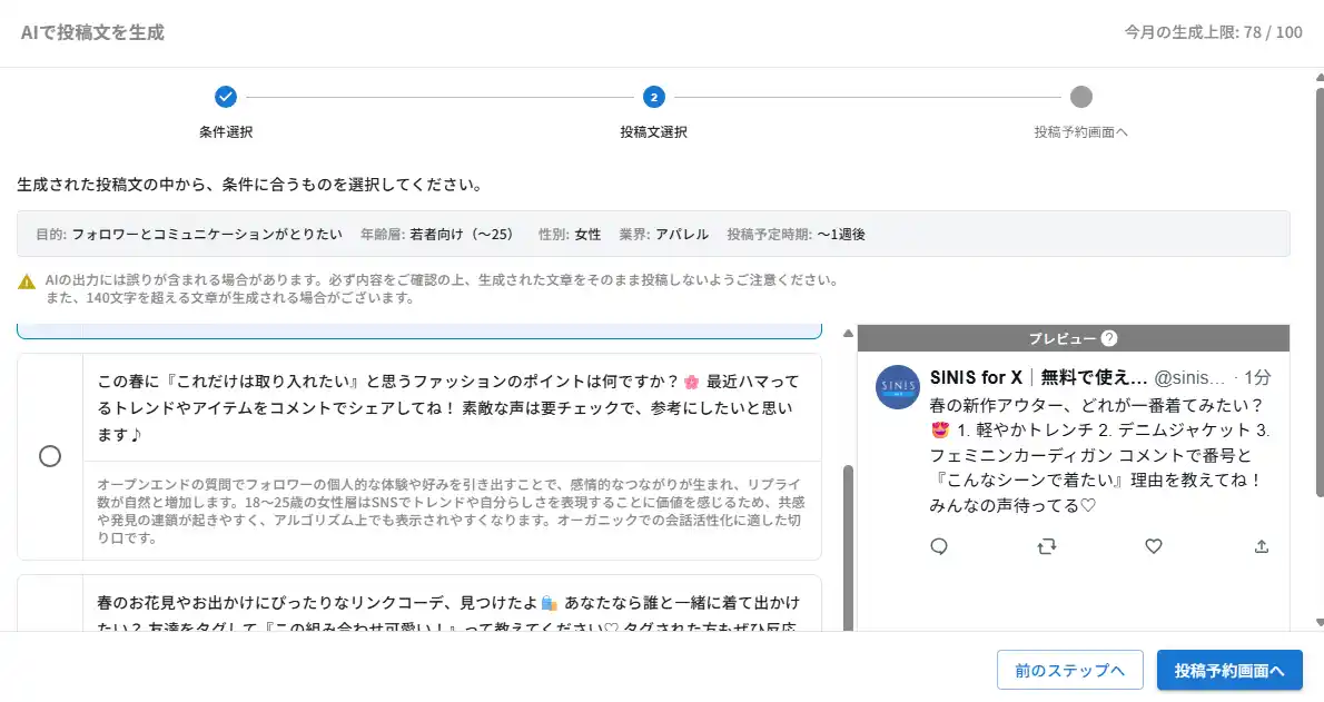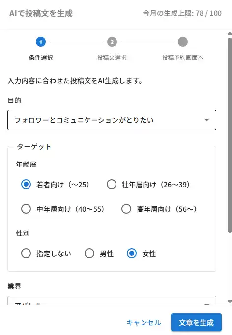 | 業界・投稿種別・ターゲット・時期を選ぶだけで、AIが投稿案を自動生成。予約投稿への連携も可能に |