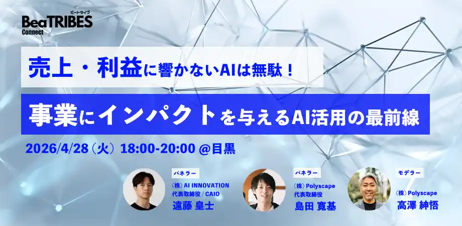 | 株式会社AI INNOVATIONは、AI活用による事業インパクト創出をテーマとしたイベント「売上・利益に響かないAI導入は無駄!事業にインパクトを与えるAI活用の最前線」を、2026年4月28日(火)に東京都品川区の「BLOCKS MEGURO」にて株式会社Polyscape様と開催いたします。 | |||||||||