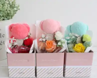 くまをモチーフにした可愛らしいフラワーブーケ。くまはタオルになるため、実用性も兼ね備えています。3色からお母さんの好きな色を選べるのも嬉しいポイントです。 |