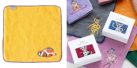 思わず微笑んでしまうような可愛らしいデザインのハンカチ。やさしい肌ざわりと吸水性の良いタオルに、プリントコットン生地でアップリケ刺繡をしました。 |
