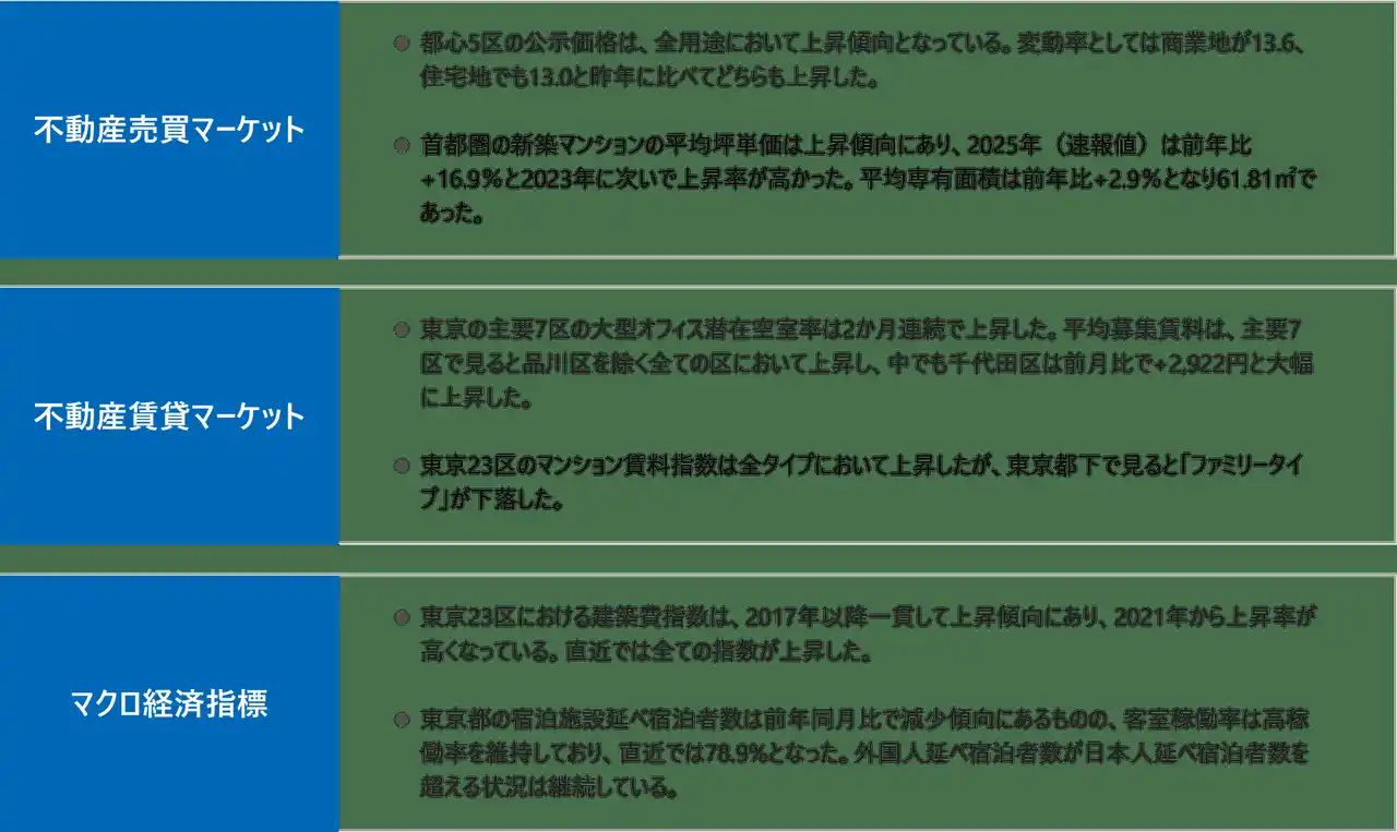 本レポートは、四半期ごとに東京エリアの市況を包括的にリポートするもので、投資家や事業者の皆様の戦略的な意思決定を支援することを目的としています。 |