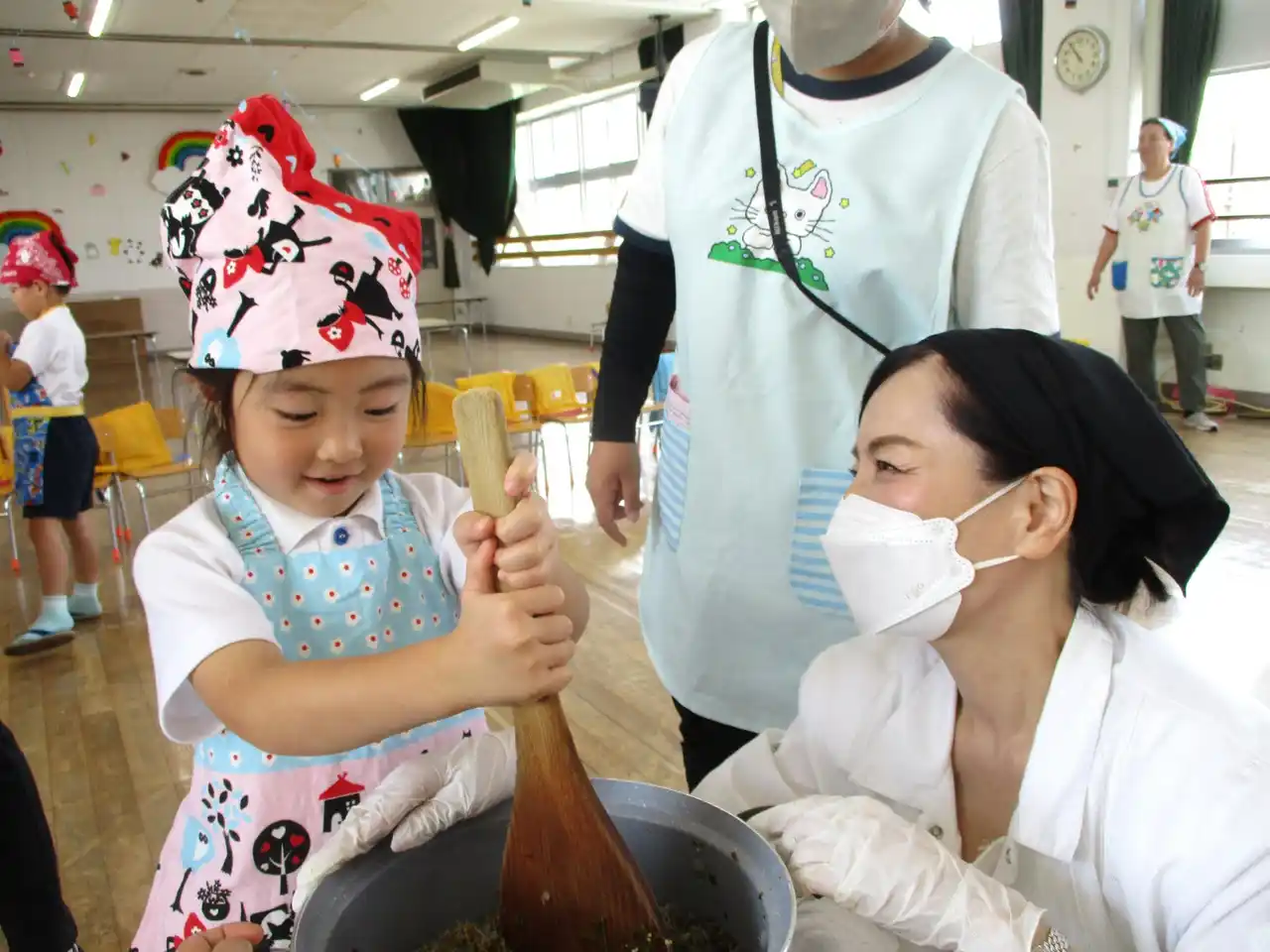 がこどもたちと一緒に体験します。当日の献立は、ちりめんじゃこと昆布の |
