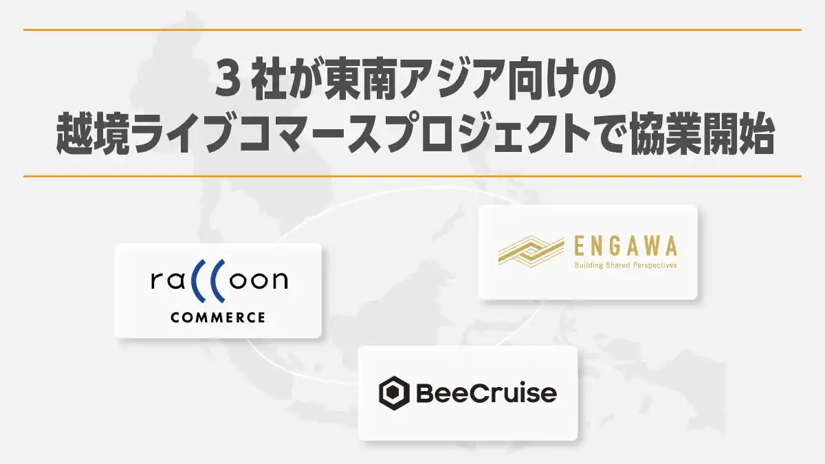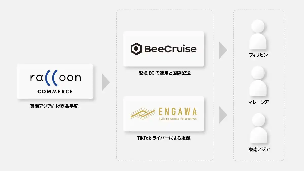 BEENOSグループで、海外マーケットプレイスへの出店支援と新規事業開発を行うBeeCruise株式会社(本社:東京都品川区、代表取締役社長:直井 聖太、以下「BeeCruise」)は、株式会社ラクーンコマース(本社:東京都中央区、代表取締役社長:和久井 岳、以下「ラクーンコマース」)、およびENGAWA株式会社(本社:東京都港区、代表取締役社長:牛山 隆信、以下「ENGAWA」)と共同で、各社の専門性を活かして日本企業の東南アジア市場への展開を目的としたライブコマースプロジェクトを開始いたします。ラクーンコマースが商品の選定を行い、BeeCruiseが越境ECの運営と販売を担当、ENGAWAが越境ライブコマースで販促を実施します。本プロジェクトはフィリピン・マレーシア市場を対象に取り組みを開始し、対象国は順次拡大予定です。 |
