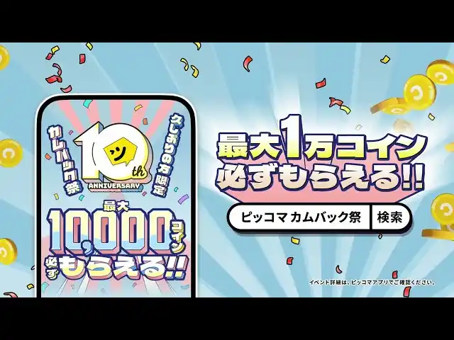 | 本日より公開の「ピッコマ」10周年記念動画では、声優・岡本信彦さんがナレーションを担当し、最大1万コインが必ずもらえる「カムバック祭」の開催を華やかに盛り上げます。 | ||||||||||||||||||