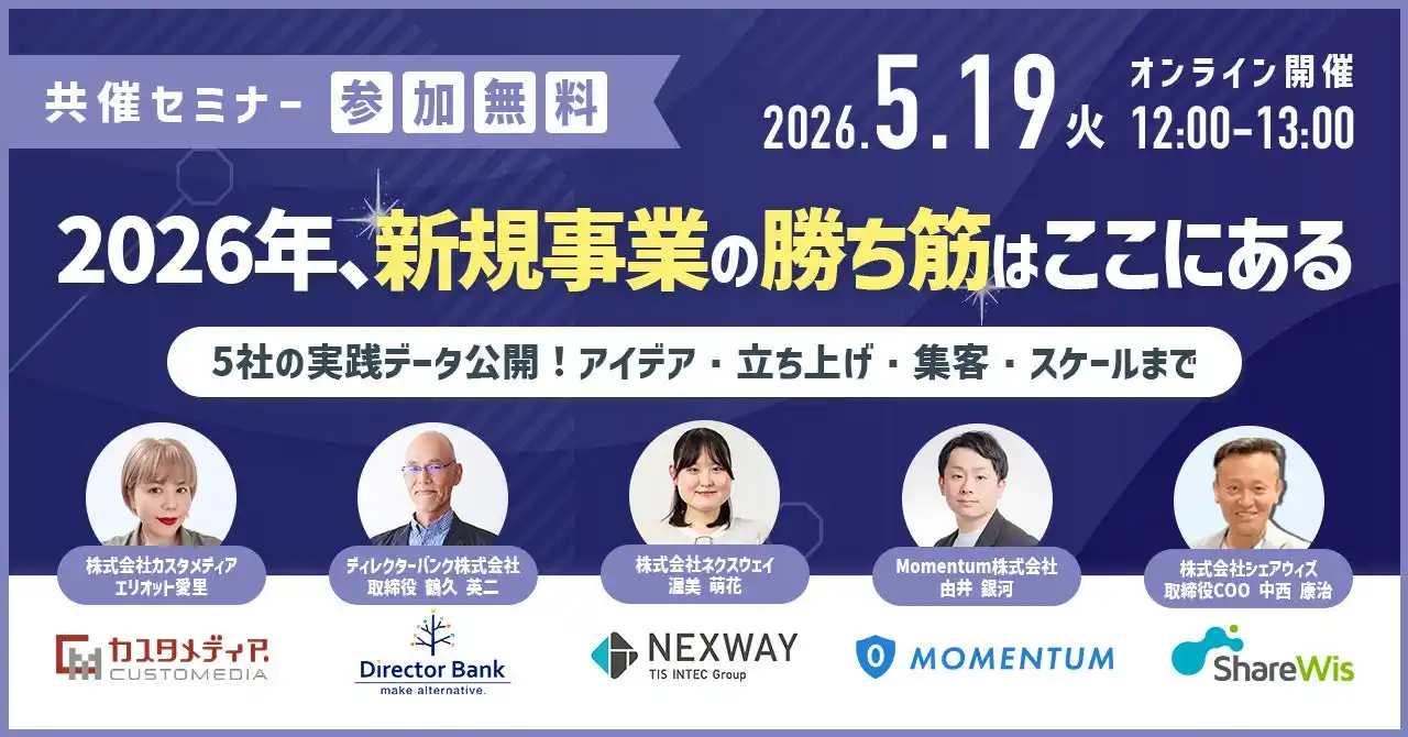 株式会社カスタメディア(本店:大阪府大阪市、代表取締役:宮崎耕史、以下 当社)は5月19日(火)12:00から、株式会社シェアウィズ(本社: 大阪府大阪市、代表取締役 辻川 友紀)開催の無料ウェビナー【5社の実践データを公開】2026年、新規事業の勝ち筋はここにあるに登壇します。