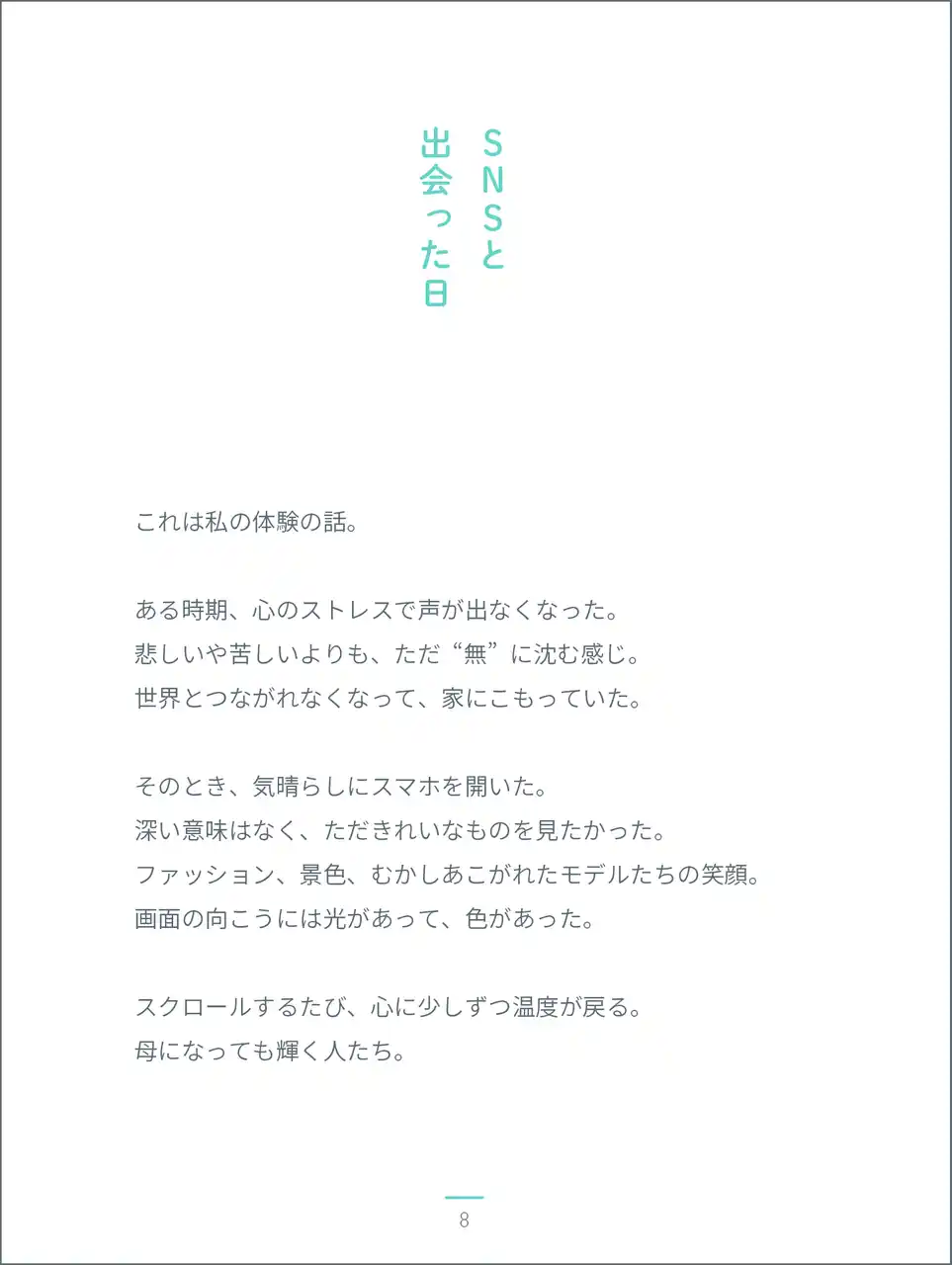 幼少期に両親の離婚を経験し、シングルマザーの母に育てられる。中学時代のいじめや心身の不調を経て、モデル事務所との出会いにより自己肯定感を回復。恋愛依存やSNSでの苦しみを乗り越えた実体験から、「承認より尊厳」という思想にたどり着く。 |