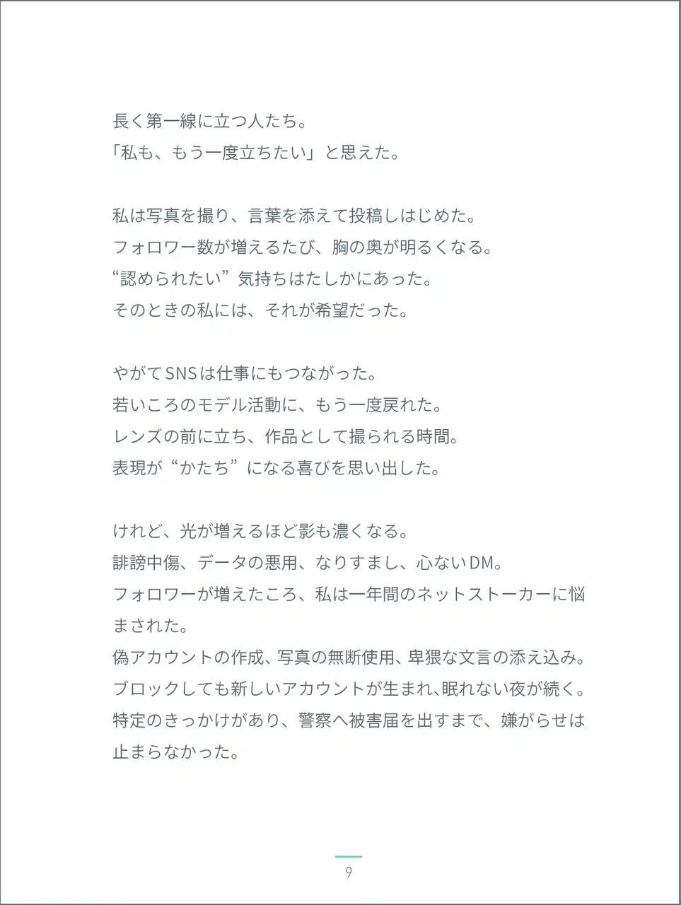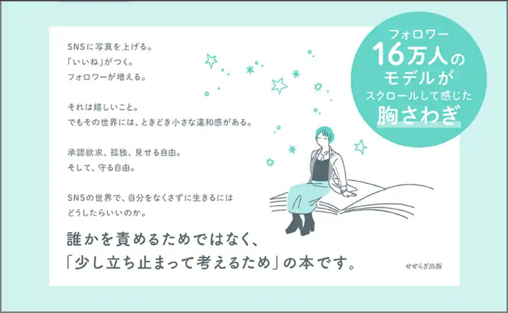 株式会社せせらぎ出版は、2026年4月10日、『かわいいね、の裏側で。 SNSが光から闇へと変わるとき』(著者:chata)を刊行いたしました。本書は、若い女性たちがSNSで自らをアピールすることを応援しつつ、一線を越えたところのリスクを問題提起しています。SNSにちょっと不安を感じる若い女性やその保護者の方に読んでいただきたい1冊です。 |
