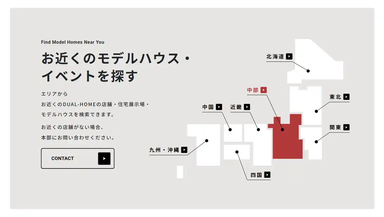 エリアごとのモデルハウス情報を整理し、お客様が理想とする住空間やインテリア事例にスムーズにたどり着けるよう直感的なインターフェースを導入。各棟の見どころを豊富なビジュアルとともに分かりやすくご紹介します。 |