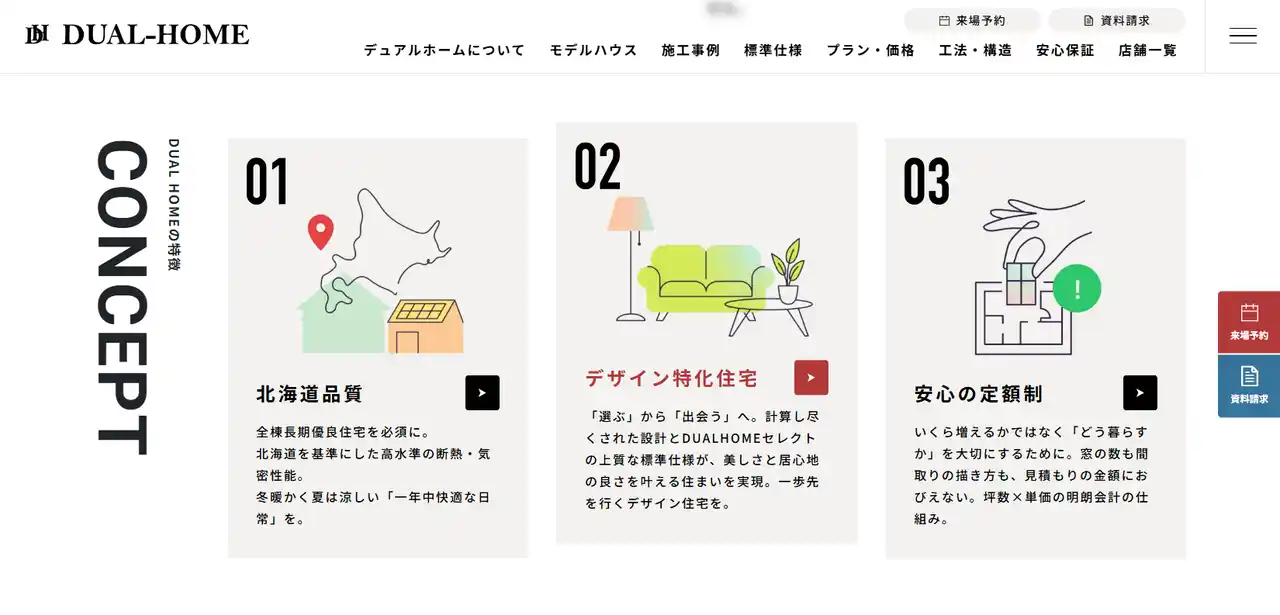 新しい公式サイトでは、DUAL HOMEが追求する「上質なクオリティ」を視覚的に表現しながら、住まいづくりを検討されるお客様を温かくお迎えする「ウェルカム感」を大切に設計いたしました。 |