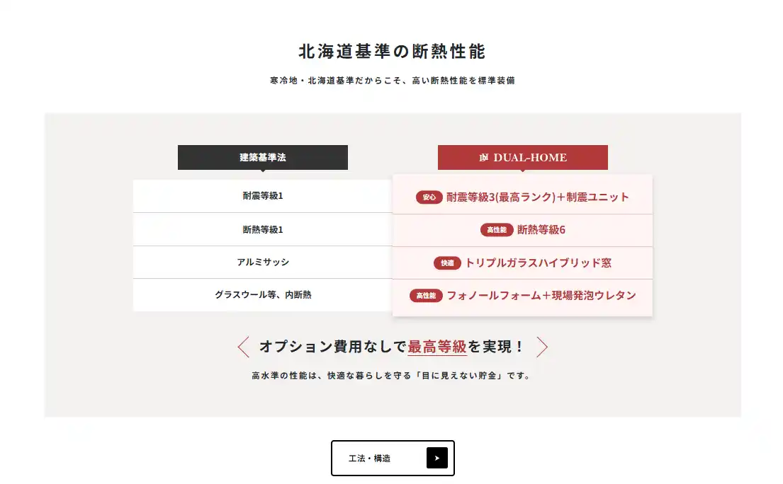 しかし、私たちは「性能が良いだけの家」では満足しません。住む人の個性を映し出し、毎日が彩りに満たされる「洗練されたデザイン」が備わってこそ、真に豊かな住まいになると信じています。aboutページでは、北海道発のブランドとして培ってきた技術の裏付けと、妥協のない空間デザインへのこだわりをご説明。DUAL HOMEが目指す"これからの住まいのスタンダード"をご体感いただける内容となっています。 |