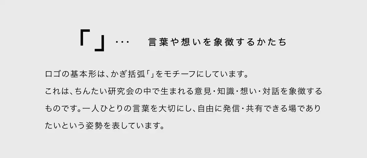 | ロゴの基本形は、かぎ括弧「 」をモチーフにしています。これは、ちんたい研究会の中で生まれる意見、知識、想い、対話を象徴するものです。一人ひとりの言葉を大切にし、自由に発信・共有できる場でありたいという姿勢を表現しています。 | ||||