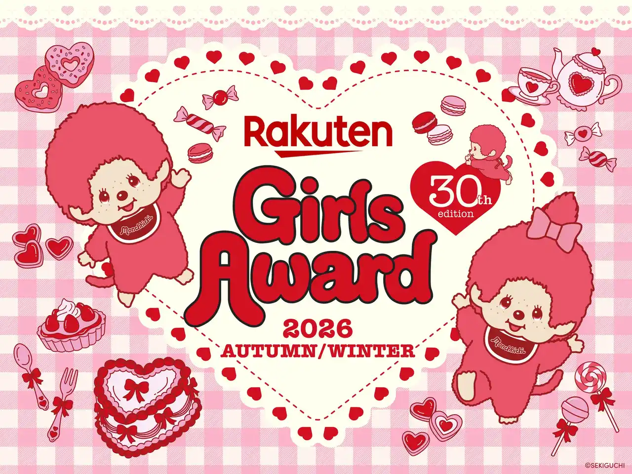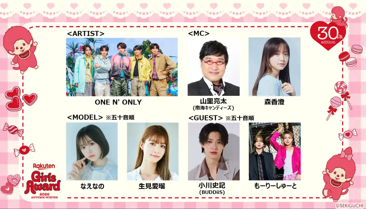 この度、イベントのキービジュアル・第1弾の豪華出演者を発表いたします。2010年の初開催から数え、今回でGirlsAwardは開催30回目を迎えます。これを記念して、大人気キャラクターモンチッチとのスペシャルコラボが実現!モンチッチは1974年に誕生し、発売と共に爆発的ブームを起こしたキャラクターで、近年若い世代にも大きな注目を集め、誕生50周年を迎えてもなお幅広い世代に愛され続けています。GirlsAwardも”時代を越えて愛される存在でありたい”という想いのもと、これまでにないGirlsAwardオリジナルカラーのモンチッチを取り入れた可愛らしい世界観のイベントキービジュアルでアニバーサリー回を彩ります。 |