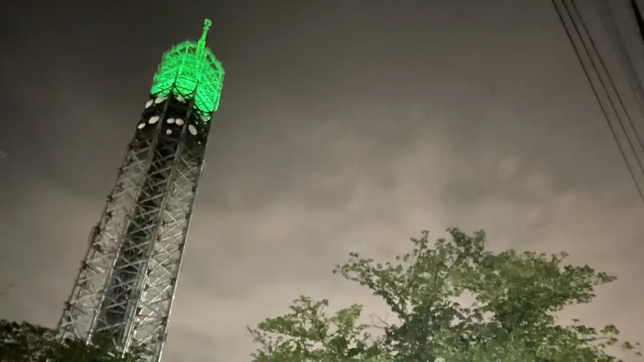 ▲夜間のライトアップにより翌日の天気(曇り)を緑色で伝えるスカイタワー西東京(通称:田無タワー) |