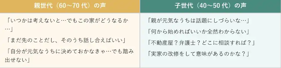 「いつかは考えないと、この家がどうなるか…」「親が元気なうちは話題にしづらい…」多くのご家庭が抱くこうした不安は、何から手を付ければ良いか分からないまま先送りされがちです。 |