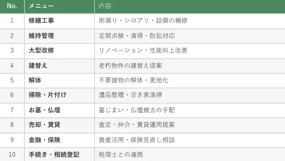 「いえつな」はお客様の資産価値を正しく把握し、「今、何をするべきか」を整理することから始めます。修繕から売却、相続まで、以下の10メニューをワンストップで提供します。 |