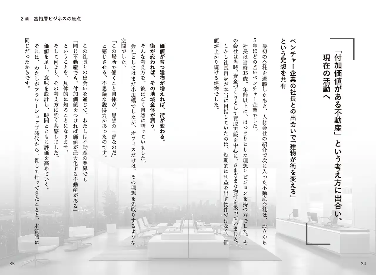 | 著者は20代から東京一等地で富裕層向けサービス業に従事し、六本木でフラワーショップを経営。そのなかで、「人は価格ではなく、感情が動いたときに意思決定をする」という本質に触れます。この経験を背景に、45歳で不動産業へ転身。 | |||||||||