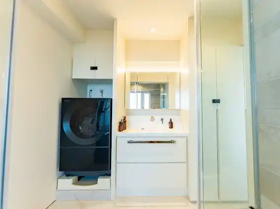 スタイリッシュなデザインに富んだ、洗練された洗面エリア。バスルームからはオーシャンビューもご覧いただけます。タオルやアメニティ類も豊富にご用意。洗濯乾燥機も完備されており、長期滞在やファミリーでのご利用にも快適な空間です。 |
