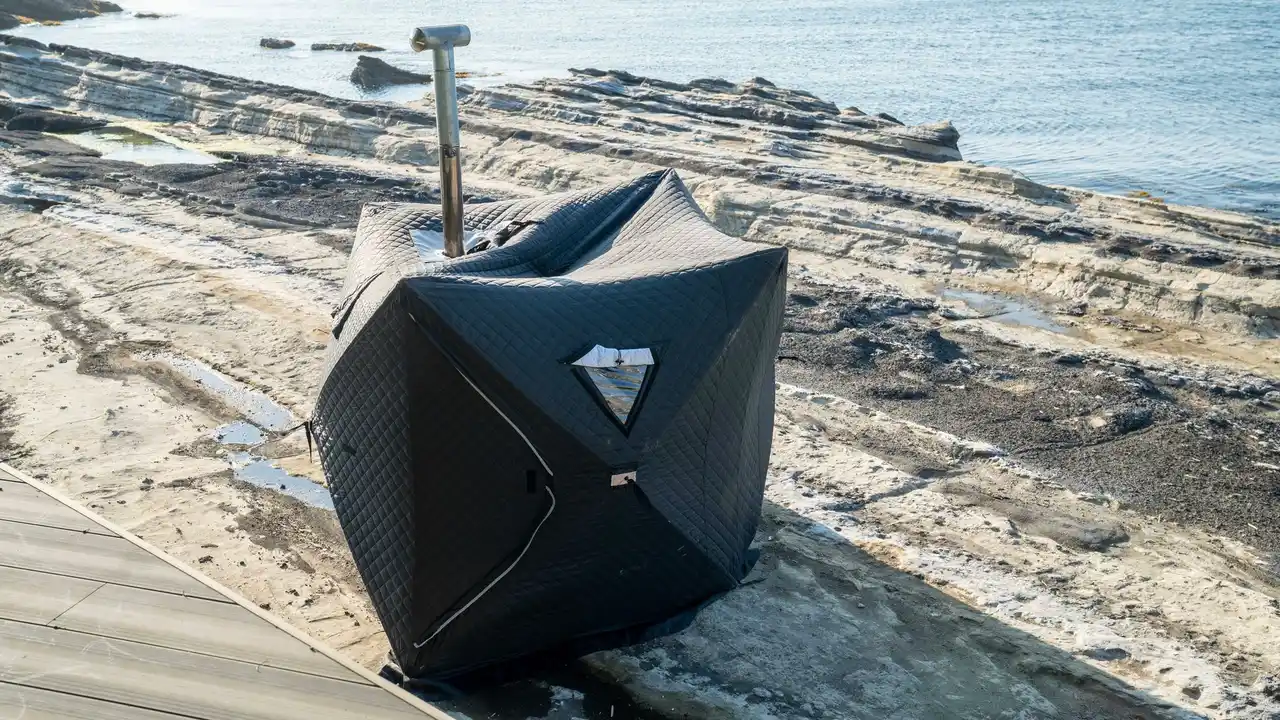 テントサウナ(準備中)。水風呂は目の前の海。 |