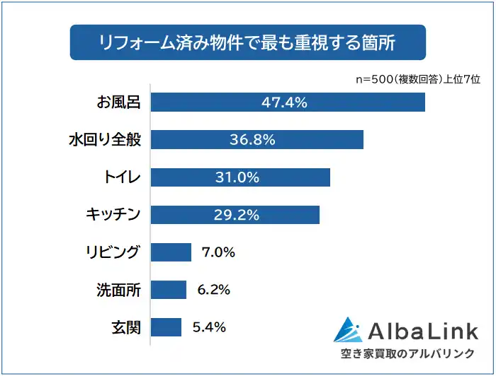 「リフォーム済み物件で最も重視する箇所」の1位は「お風呂(47.4%)」でした。2位「水回り全般(36.8%)」、3位「トイレ(31.0%)」、4位「キッチン(29.2%)」が続きます。 |