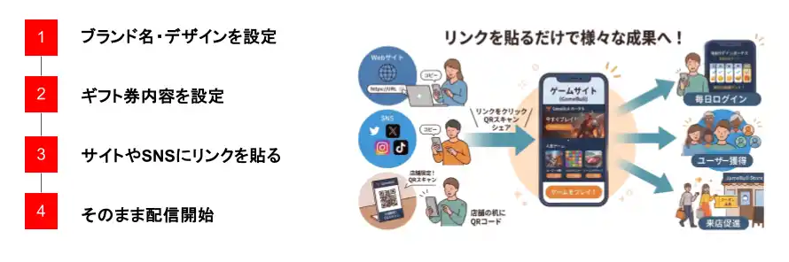 | 飲食店、クリニック、小売、サロン、娯楽施設をはじめとする、あらゆる規模の消費者向け事業者を対象に展開してまいります。また、本事業は、企業側がコスト負担なく導入できる設計を志向しており、自社でゲームやアプリを新規開発することなく、手軽にブラウザベースでサービス導入できる点を特長としています。これにより、導入ハードルを抑えながら、顧客接点の強化、販促施策の高度化、店舗の広告収益機会の創出を目指します。 | |||