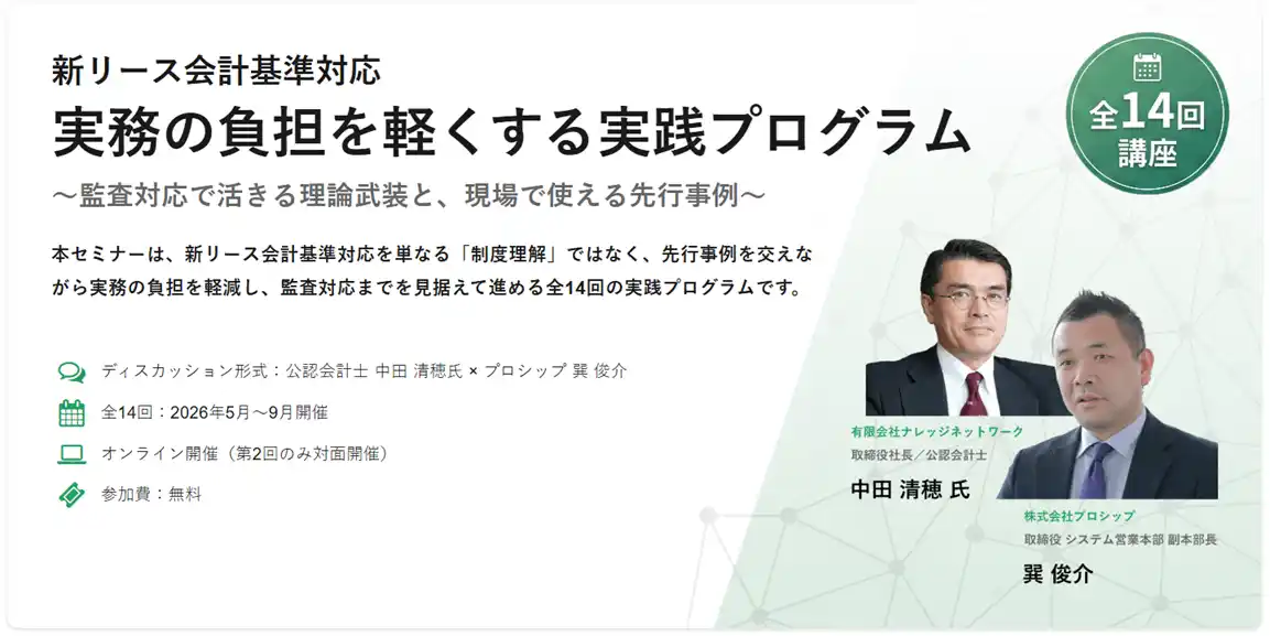株式会社プロシップ(本社:東京都千代田区、代表取締役社長:鈴木 資史)は、2027年4月より適用が開始される新リース会計基準に向け、企業の経理・財務担当者様を対象とした無料の実践プログラム(全14回)「新リース会計基準対応|実務の負担を軽くする実践プログラム」を、2026年5月から9月にかけて集中的に開催いたします。 本プログラムは、単なる制度の解説にとどまらず、先行事例を交えながら、実務負担をいかに軽減し、監査対応までを見据えてどのように判断・整理を進めるかに焦点を当てた、実践的なプログラム講座です。 |
