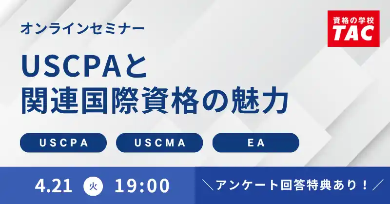 当セミナーではステップアップや転職の武器にもなるUSCPAなど魅力や受験手続き、そして、TACのコンテンツと共にご紹介いたします。これから初めてUSCPAを目指す方、英語や会計力を身に付けるために必要な資格を検討中の方におすすめのセミナーです。 |