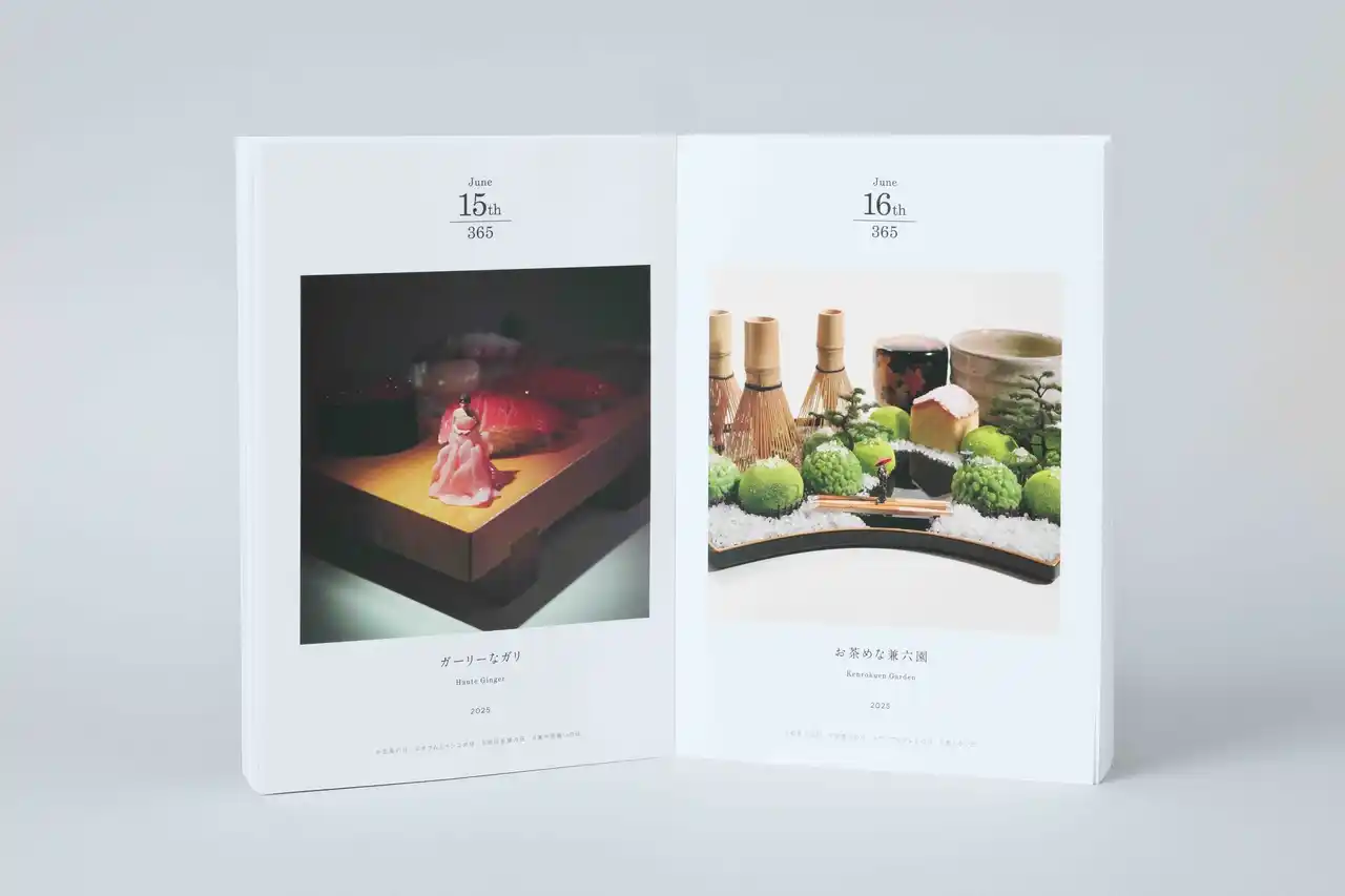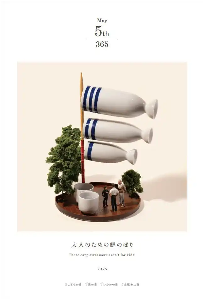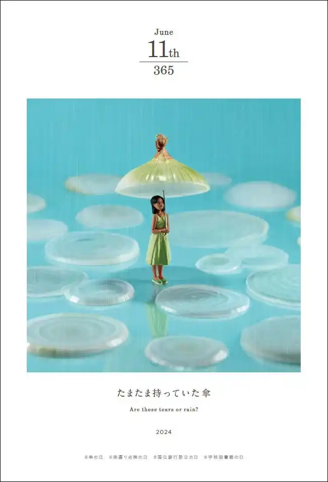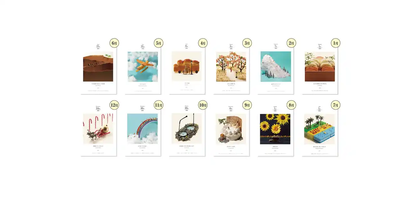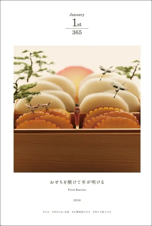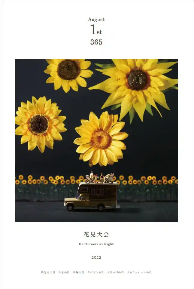| 本書は、15年間に制作・撮影された5,000点以上の作品群の中から、1ページ1日1作品とし、1年分の作品を田中氏が厳選。「自分基準で作品を選びたくなかった」という著者のこだわりから、伝統行事や毎日、必ず何かしらある設定されている「○○○の日」とリンクする作品を掲載することで、見た人の共感を得られるような楽しい構成となっている。 | |||||||||||||||