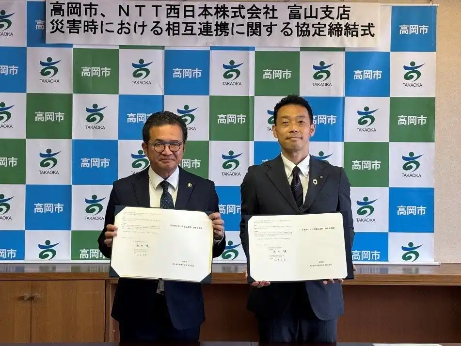NTT西日本株式会社富山支店(支店長:瓜生 知史、以下「NTT西日本」)は、高岡市(市長:出町 譲)と地域の防災力強化および災害時の迅速な通信復旧体制の構築を目的として、「災害時における相互連携に関する協定(以下、本協定)」を、2026年4月20日(月)に締結いたしました。 |