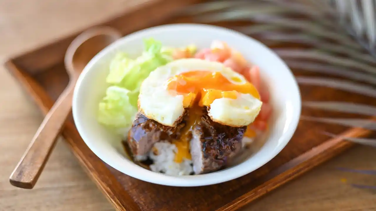 シェフが鉄板で仕上げるガーリックライスに、目玉焼きやハンバーグをのせて。食べ応え抜群のローカルフードです。 |
